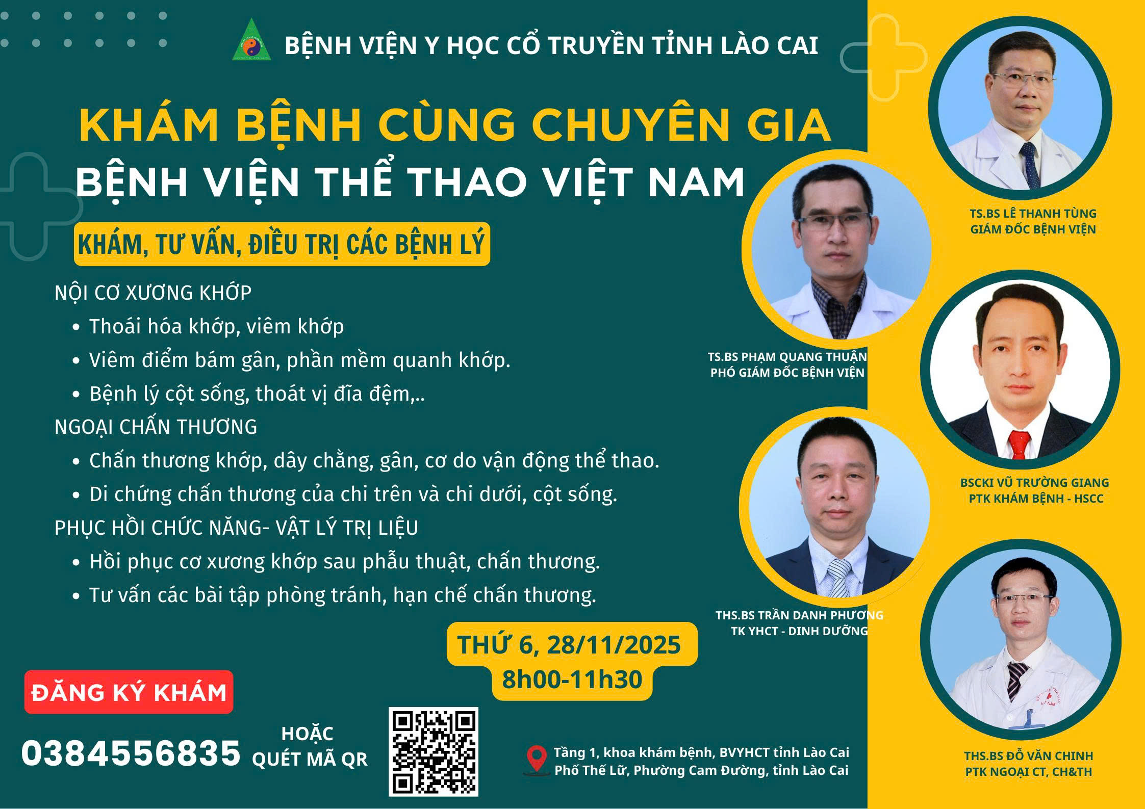 Địa điểm: Phòng khám Chuyên gia – Tầng 1, Bệnh viện Y học cổ truyền tỉnh Lào Cai (Phố Thể Lữ, phường Cam Đường, TP. Lào Cai)