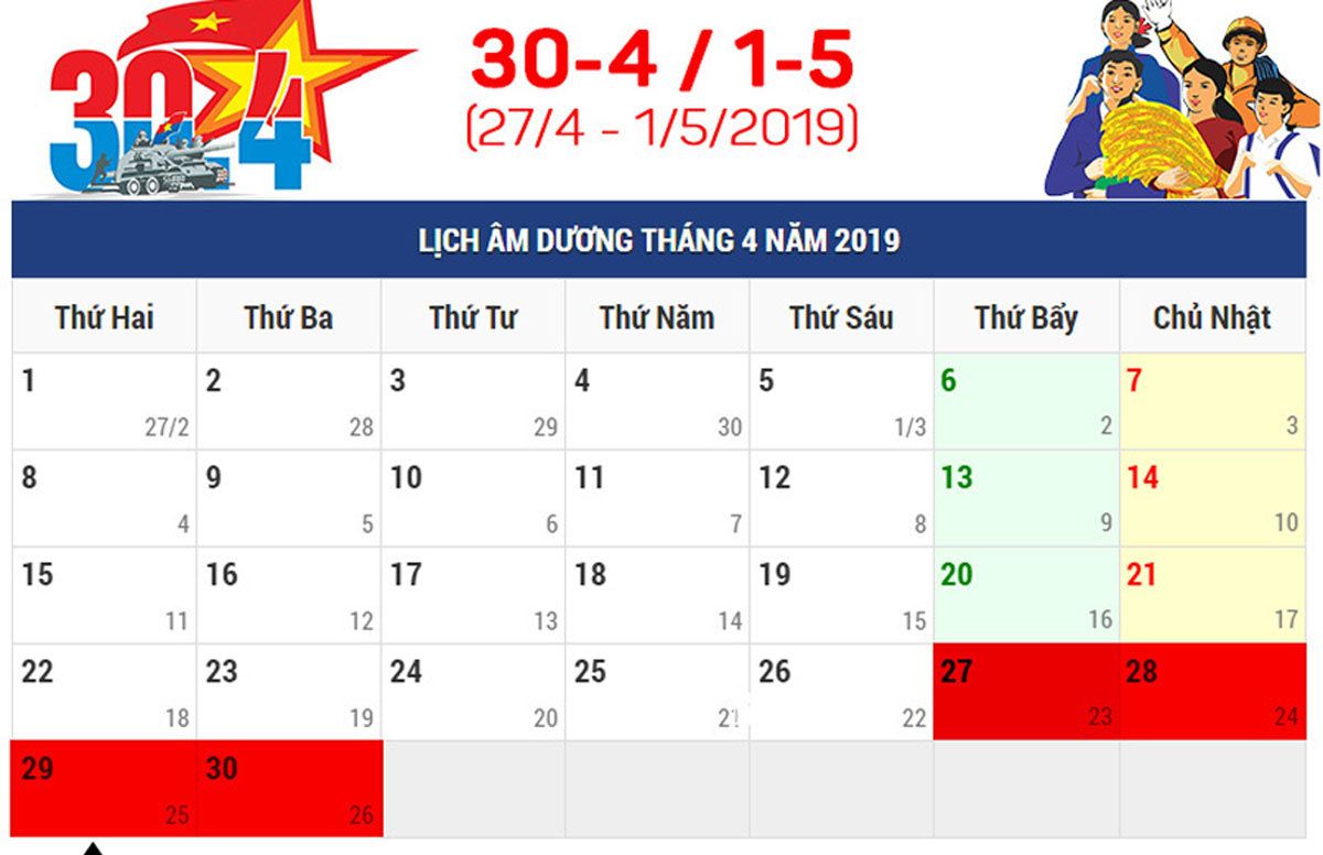 - Thời gian nghỉ : 05 ngày, từ ngày 27/4 đến hết ngày 1/5/2019